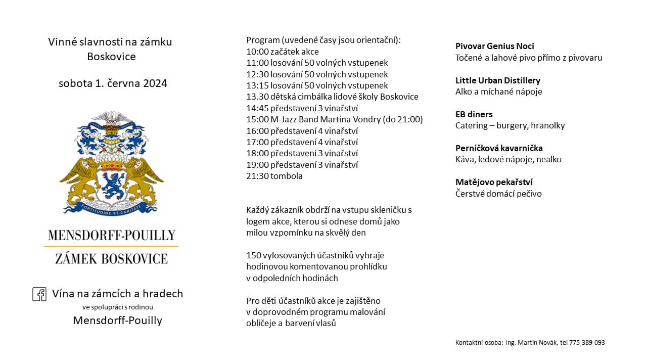 Ochutnávka vín ze 17 vinařství, živá hudba, studená i teplá kuchyně, tombola a spousta zábavy pro děti i dospělé. Každý účastník obdrží na vstupu skleničku s logem akce, kterou si odnese domů jako milou vzpomínku. Během dne proběhne losování vstupenek o účast na prohlídce historických interiérů zámku. Pro děti je v doprovodném programu zajištěno malování na obličej a barvení vlasů. Kromě ochutnávky vín se představí se svými produkty Pivovar Genius Noci, s míchanými nápoji Little Urban Distillery, EB diners s výbornými burgry a dále pak Matějovo pekařství a Perníčková kavárna.