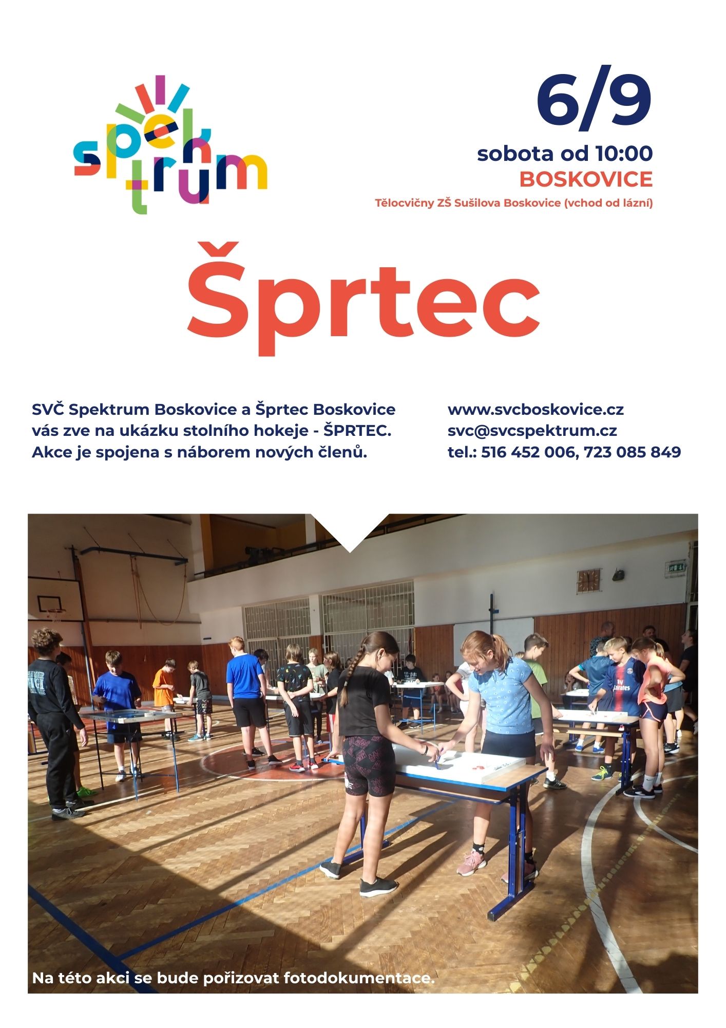 SVČ Spektrum Boskovice a Šprtec Boskovice vás zve na ukázku stolního hokeje - ŠPRTEC. Akce je spojena s náborem nových členů.