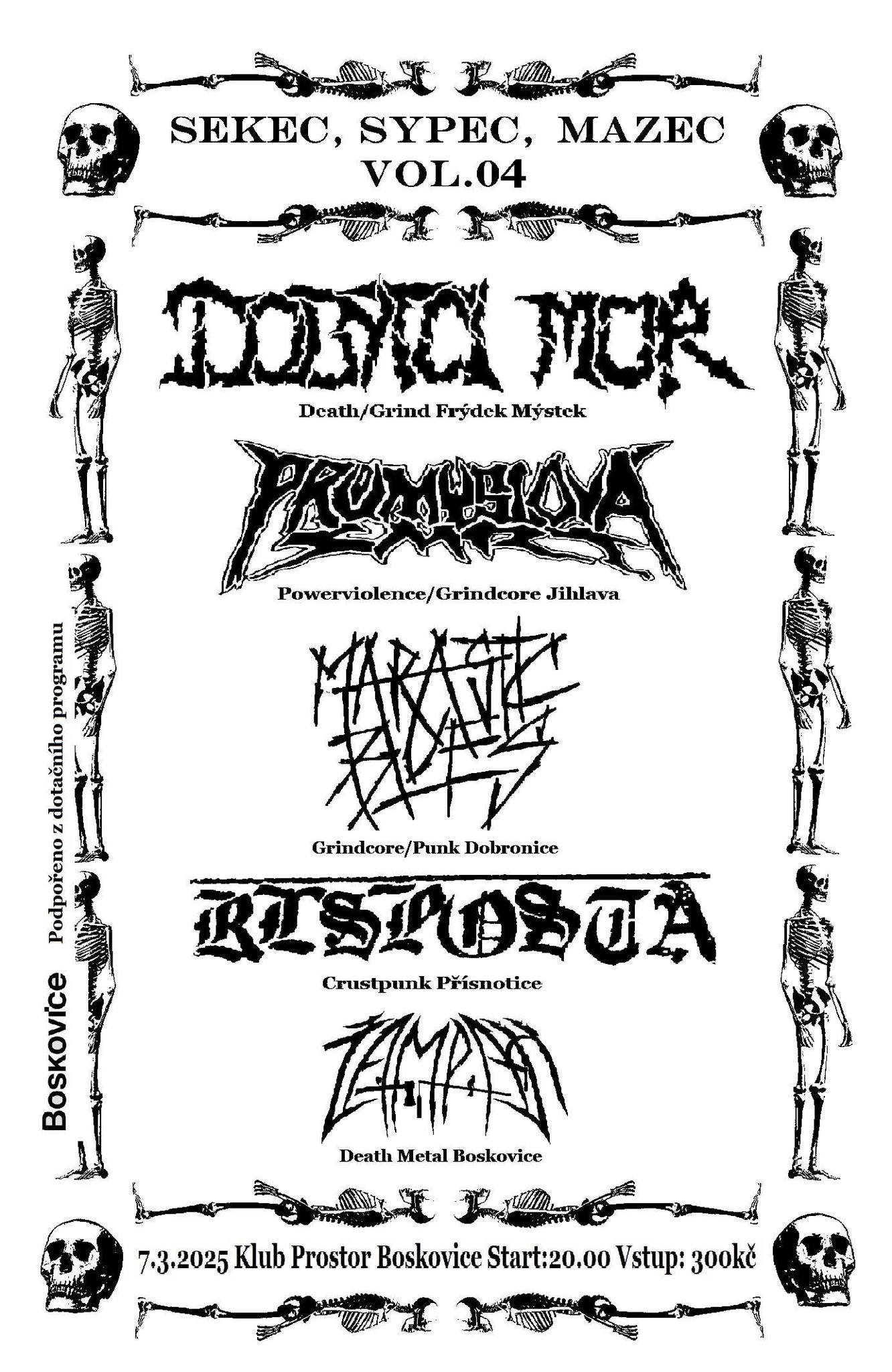 První letošní koncert tvrdých kytar, zahrají: Dobytčí Mor - Death/Grind, Frýdek Mýstek, Průmyslová Smrt - Powerviolence/Grindcore, Jihlava Risposta - Crustpunk, Přísnotice Marastic Blues - Grindcore/Punk, Dobronice Žampach - Death/Grind, Boskovice. Více informací v události.