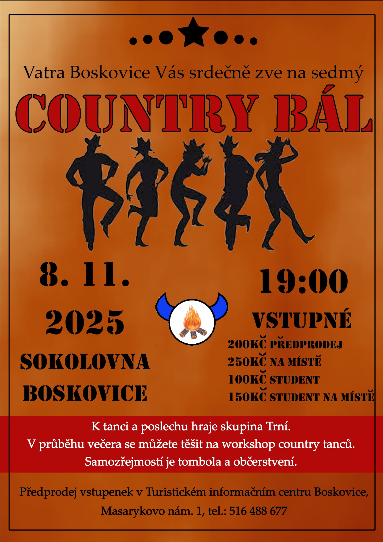 Již sedmý ročník Country bálu pro všechny, kteří chtějí strávit příjemný večer s kapelou Trní. V průběhu večera dojde i na výuku country tanců, bude se losovat tombola. Dobré občerstvení je samozřejmostí!