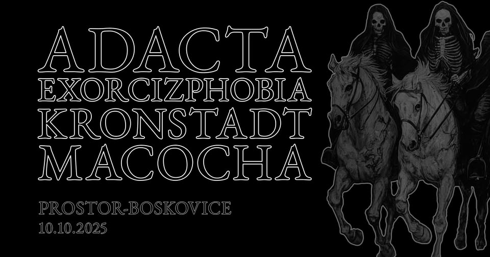 10. října se v boskovickém Prostoru chystá metalový večírek! Vystoupí slovenská crustová mašina Adacta, trutnovští thrash metalisti Exorcizphobia, brněnský black metal Kronstadt a blanenská Macocha. Nabitý program, který ti nedá vydechnout.