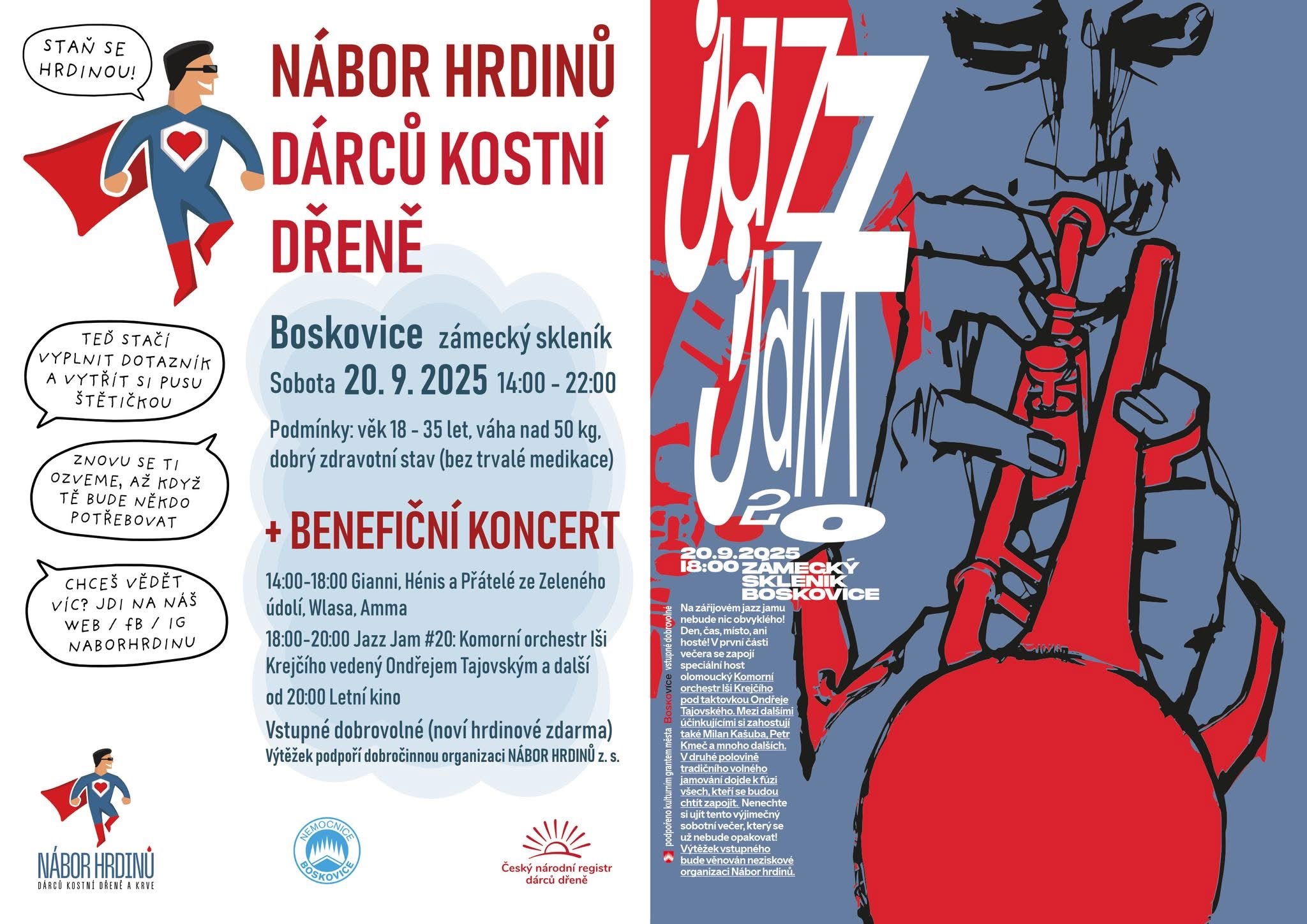 Světový den dárců kostní dřeně společně oslavíme 20. září v Boskovicích - Zámeckém skleníku náborem nových dárců kostní dřeně a benefičním koncertem na podporu dobročinné organizace NÁBOR HRDINŮ z. s.