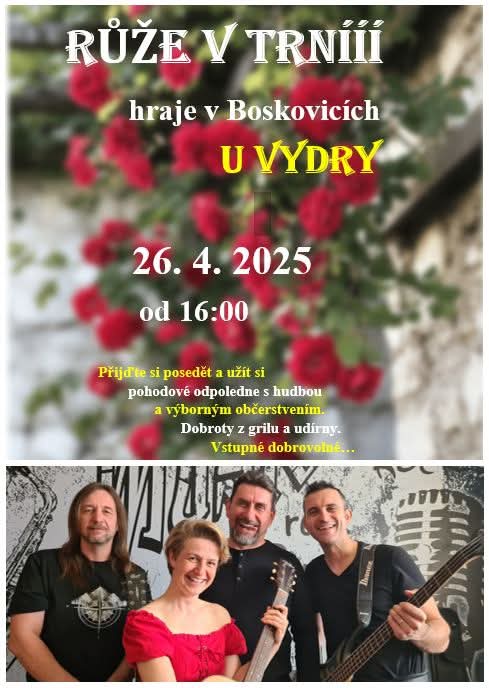 Přátelé a kamarádi, rádi bychom vás pozvali v sobotu 26.4. na živou hudbu.. Zahrají vám RŮŽE V TRNÍÍÍ ⚘️⚘️⚘️