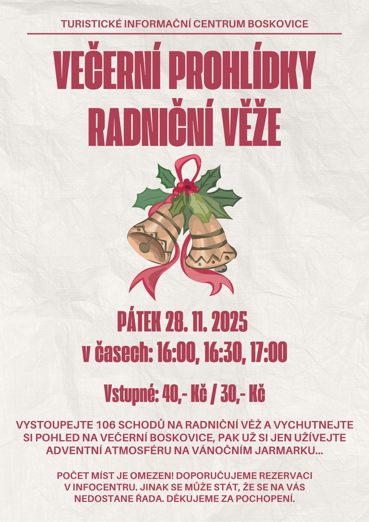 V pátek 28. 11. 2025 v časech: 16:00, 16:30 a 17:00 můžete vystoupat na radniční věž a užít si tak večerní pohled na adventní Boskovice.
